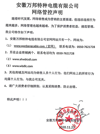 鄭重聲明:安徽萬邦特種電纜有限公司官方網站為:www_wanbangcable_com.kghfw.com,除此之外無任何子網站或合作網站,其余均為假冒偽劣。電話:0550-7621728 13485756353 地 址:安徽省天長市滁州高新技術產業開發區經四路29號